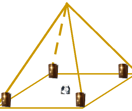 – positionner aux 4 angles du carré, les piliers, (baguettes en cuivre de 4 cm) et le dodécaèdre, en cristal de roche, au centre des diagonales.
